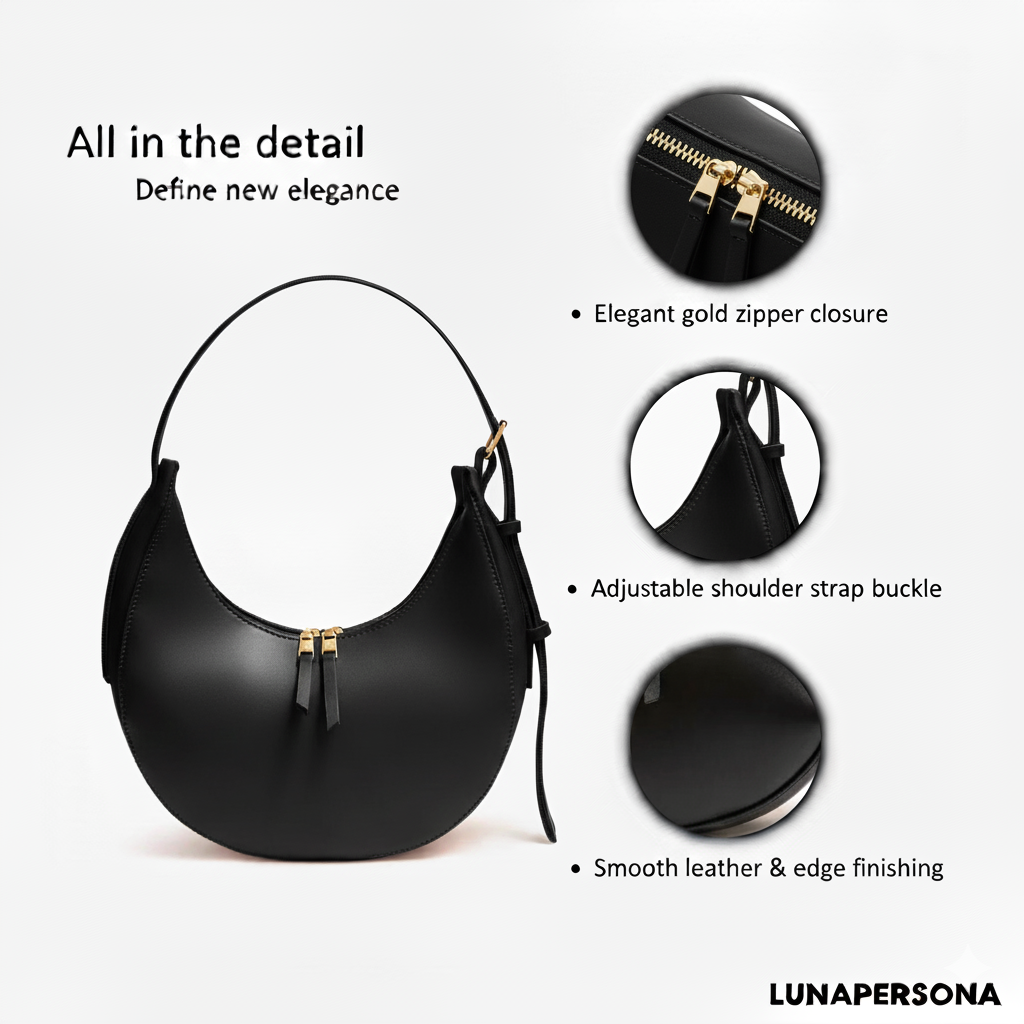The Half Moon Black blends minimalist form with practical detail. With its curved silhouette and spacious interior, this piece is thoughtfully designed to carry your daily essentials while complementing both casual and refined looks.